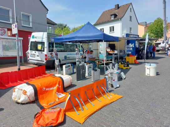 - Installieren Sie mobile Schutzelemente wie Fensterklappen und Wasserbarrieren sowie Aufkantungen an Lichtschächten und Kellereingängen.